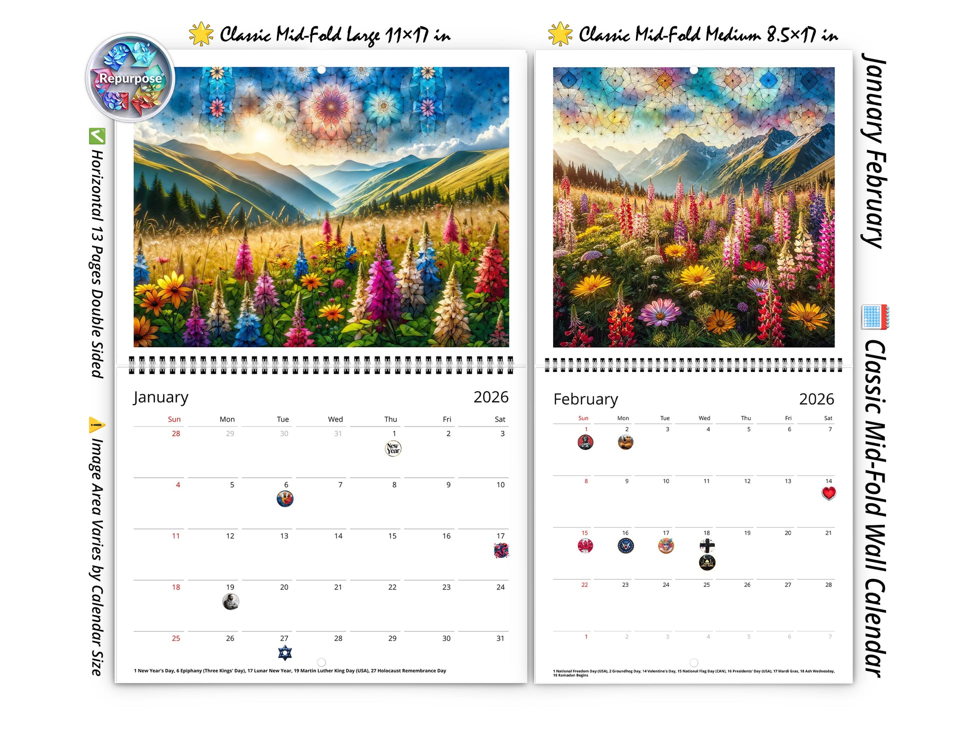 📅 Classic Mid-Fold: 13 double-sided pages, ideal for repurposing and upcycling.